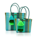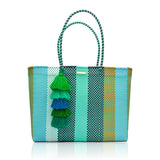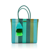 Handcrafted from 100% recyclable plastic by Mexican artisans, this chic tote is created to captivate everyone's eyes with its vibrant colors and trendy, durable design.